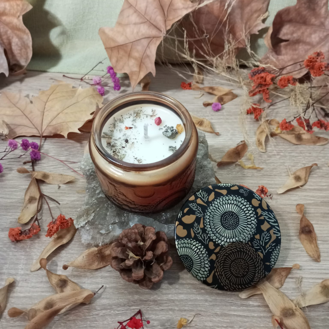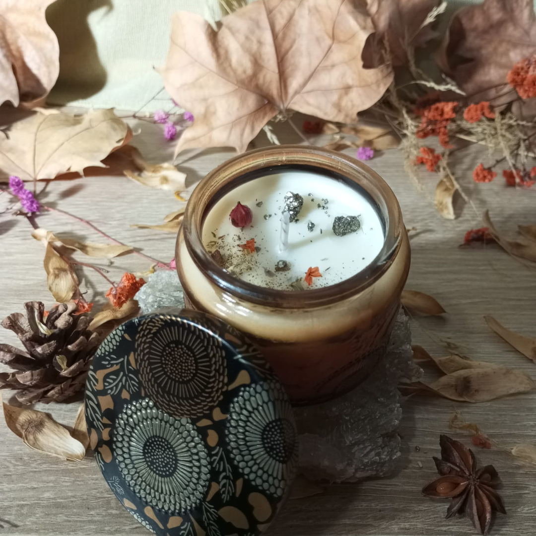 Cada una está hecha a mano con cera de soja 100 % natural, decorada con flores secas y pequeños minerales que añaden un toque único y elegante a tu espacio. Al ser de origen vegetal, la cera de soja quema de manera más lenta y limpia, convirtiéndose en una elección perfecta para quienes buscan productos respetuosos con el medio ambiente y sostenibles.